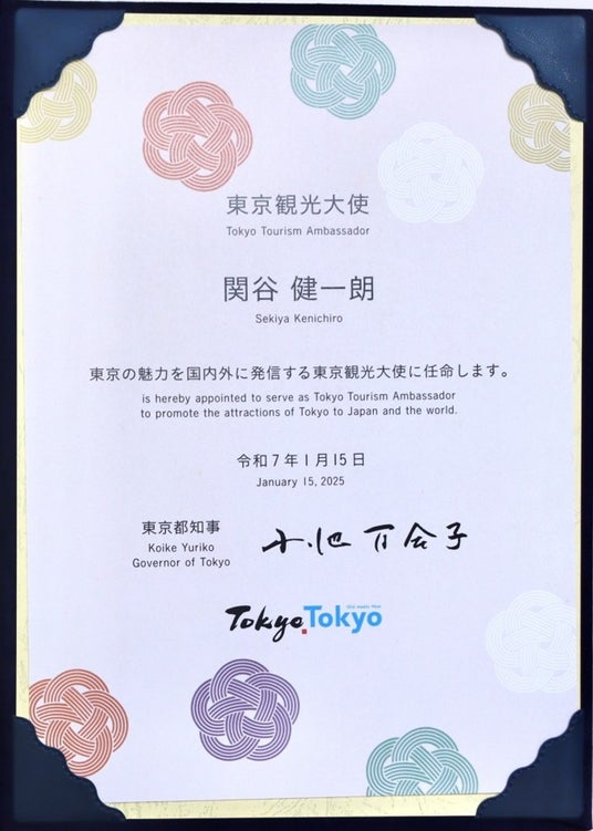 - 関谷 健一朗は伝統的な和食をはじめ、世界各国の多彩な料理を楽しめる東京の「食」の魅力を効果的に発信し誘客につなげるため、東京都知事 小池百合子氏より 『東京観光大使』を拝命いたしました。