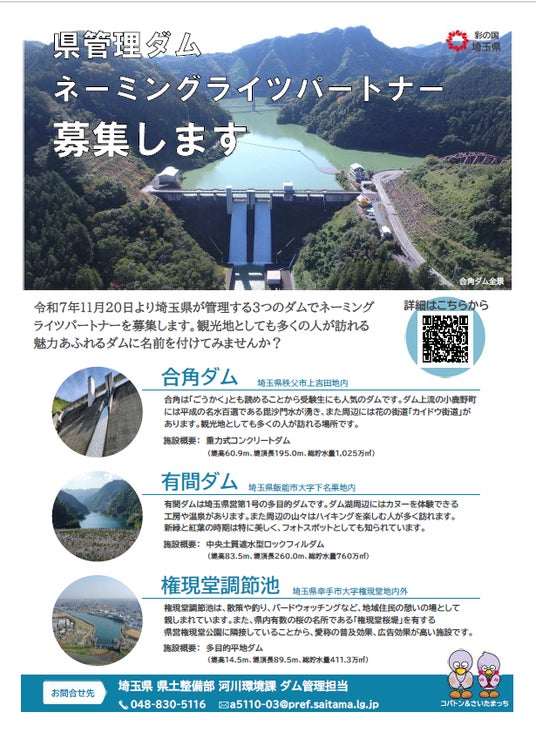 本日より、観光でも多くの人が訪れる「合角ダム」「有間ダム」「権現堂調節池」のネーミングライツパートナー(愛称の命名権者)を募集します。