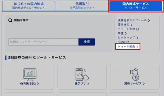 国内株式TOPの「国内株式サービス」タブ内の「ショート動画」をクリック