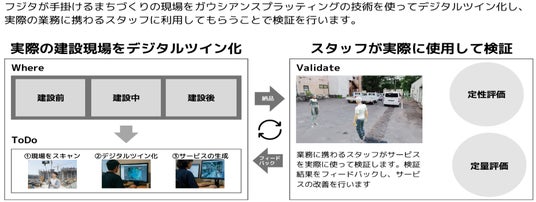 デジタル空間において非常に繊細な描画が可能となる3Dガウシアン・スプラッティング技術(※)を有する株式会社ビートバップと、大規模な建設工事等を行う株式会社フジタが連携して、まちづくり、建設におけるデジタルツインの新たなモデル活用の検証に取り組む。この取組により、没入感の高いデジタル空間を再現することで、現地に行かずとも、現場が完成していなくても、現場のダイナミズムと機微を体験できる都市開発の新たな方法を生み出す。そして、様々な関係者同士のインタラクティブなコミュニケーションを促進し、新たなアイディアの醸成とその実装を目指す。