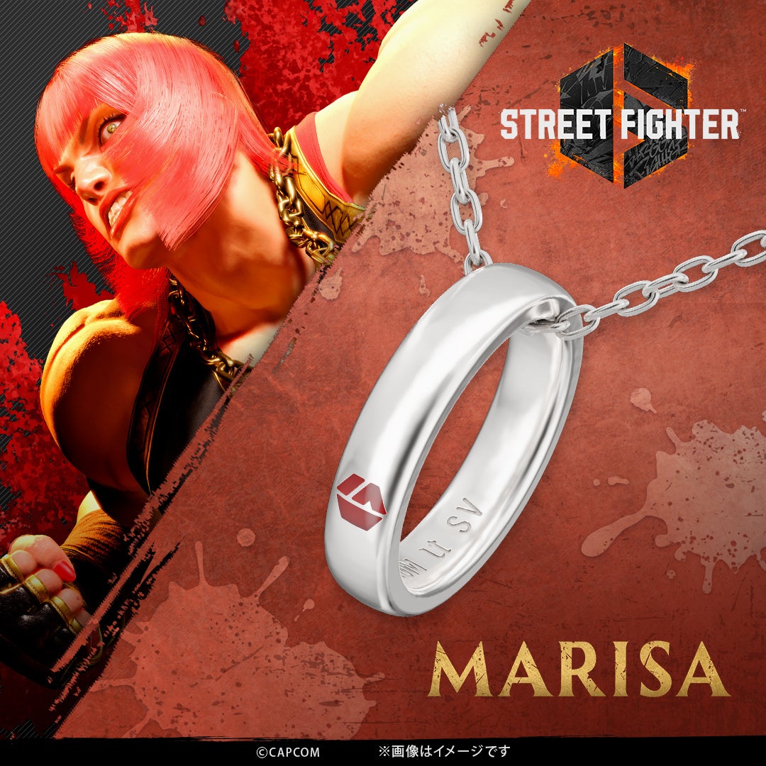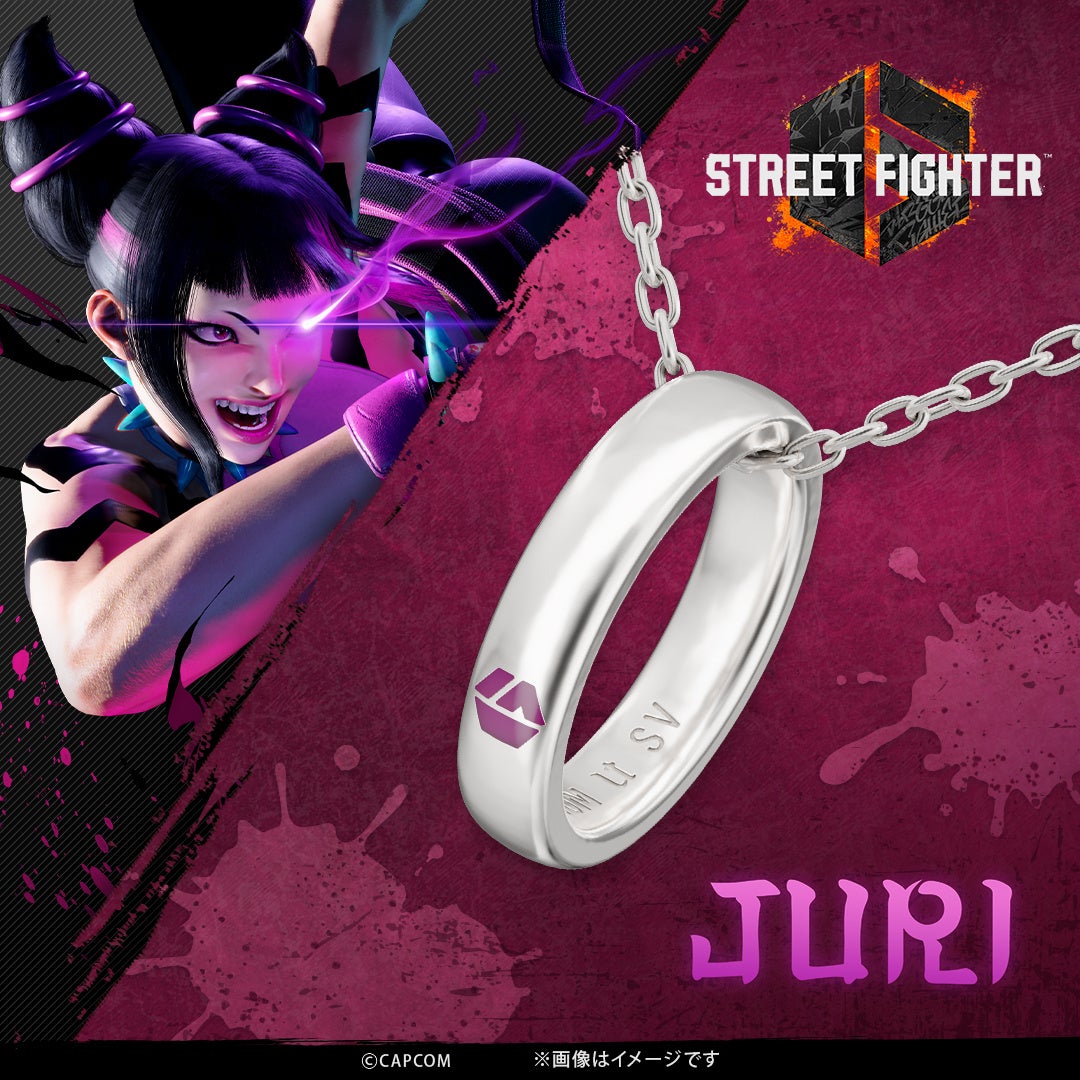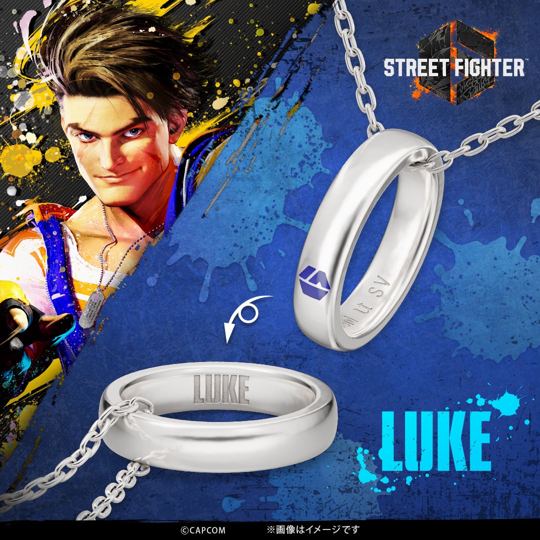 このたびの新作は、「ストリートファイター6に登場するキャラクターのイメージカラーと名前の刻印をあしらったデザインのリングネックレスです。リングタイプのネックレストップはチェーンから取り外しができるので、お手持ちのチェーンに通したり、重ね着けするなどのアレンジもお楽しみいただけます。