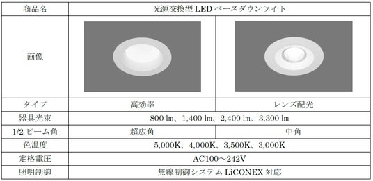 高効率タイプとレンズ配光タイプの2種類を用意しており、光量は800~最大3,300㏐(ルーメン)まで対応しているため、高照度が求められる施設や現場でも安心して使用できます。さらに、調光信号線が不要な当社の無線制御システム「LiCONEX(ライコネックス)」と接続することで、スイッチやタブレット端末などから、状況や用途に応じて照明を無線で調光できます(※6)。施設向けの光源交換型LEDベースダウンライトとして無線調光に対応するのは業界初(※7)で、ユーザーの利便性向上とさらなる節電を実現します。