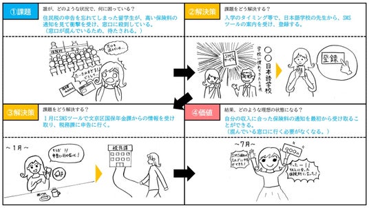 問題を解決するには、国民健康保険料の計算に必要な「住民税の申告」について外国人留学生が正しく理解することが重要だとわかりました。内容を理解して自発的に行動できるように、留学生のメリットが高くシンプルな表現の情報をSMS(ショートメッセージサービス)で配信するサービスを企画しました。日本語学校の先生が生徒である留学生にこのSMSの登録を促し、理解を深めてもらうことで、留学生の収入に合った保険料通知をはじめから受け取ることができ、問い合わせる必要が無くなる効果が得られると想定しています。今後は、次回の申告時期に向けて、より効果的なメッセージ送信サービスの検討を進めていきます。