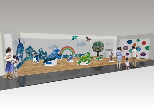 本企画では、まるで絵本の世界から生きものたちが飛び出てきたような特別展示や、生きものたちの知識を学びながら楽しめる生きもの探しカードなどの、色とりどりで、華やかな「エリック・カールが描く生きものたち」を通して、いきいきとした生きもの本来の魅力を体感できるコンテンツが盛りだくさんです。