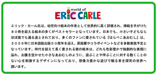 本企画では、色とりどりで、華やかな「エリック・カールが描く生きものたち」を通して、いきいきとした生きもの本来の魅力を体験できるコンテンツが盛りだくさんです。