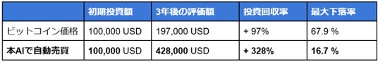 本AIは、ビットコイン価格と比べて 約3.4倍 の収益率、最大下落率は 約1/4 となりました。