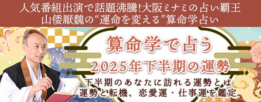 大阪ミナミの占い覇王として数々の番組やメディアで人気を博している山倭厭魏(やまとおうぎ)による本格算命学サイト『山倭厭魏の算命学』にて、この度算命学で占う『2025年下半期の運勢占い』を無料公開いたしました。生年月日を入力するだけで、2025年下半期にあなたに訪れる運勢や今後の転機、未来の重要な出来事、仕事運、恋愛運などを占うことができます。