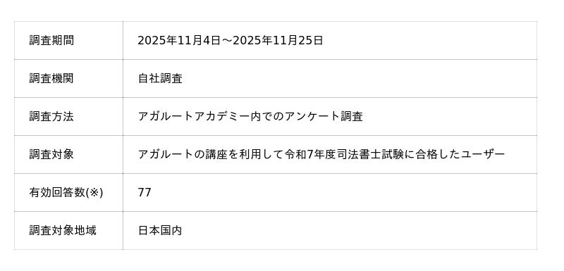 株式会社アガルート(本社:東京都新宿区、代表取締役:岩崎 北斗、以下「アガルート」)が運営する「アガルートアカデミー」は、アガルートの講座を利用して司法書士試験に合格したユーザーに対してアンケートを実施いたしました。