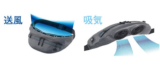 また、防水生地と止水ジッパーを採用しているほか、吸気ファンが下向きについているので雨水が内部に入りにくく、雨の日も安心して使用できます。レインウエアと組み合わせるとウエア内側の湿気やベタつきを防ぐことが可能です。さらに、付属の延長ベルトで長さ調節ができるため、約53cm~126cmの幅広いウエストサイズに対応し、家族や仲間で使いまわしができます。