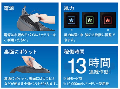 本体下部に組み込まれた2つの小型の吸気ファンが空気を吸引し、本体上部前面に設けられている送風口から背面全体に風を送る仕組みです。吸気ファンを小型にすることで本体のスリム化を実現し、薄着でも目立ちにくく、服装を選ぶことなくスマートに装着できます。風力は3段階調節ができ、最長13時間連続作動が可能です。