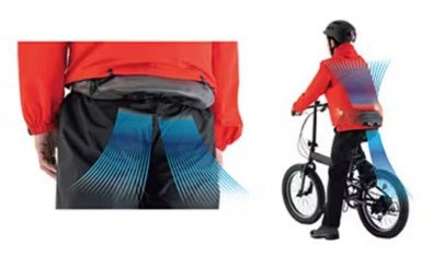 吸気ファンが下向きについており、雨水が内部に入りにくい構造に加え、防水生地と止水ジッパー採用で雨の日も安心。レインウエア着用時の内側の湿気やベタつきを防ぐことも可能。