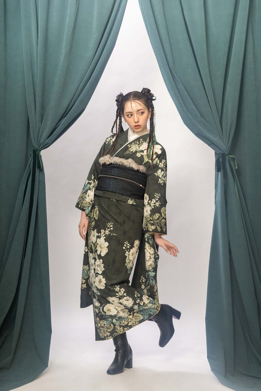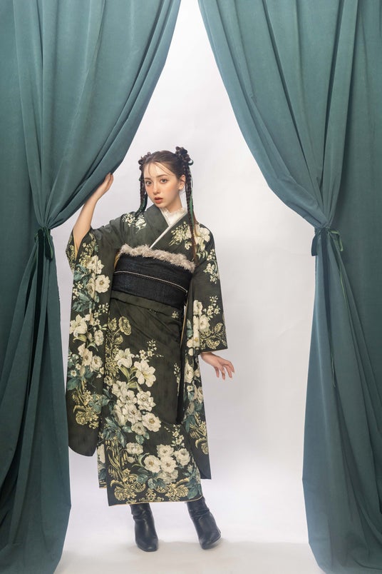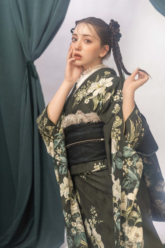 深い緑に細やかな花柄が施されたpremier lineの振袖を着用。