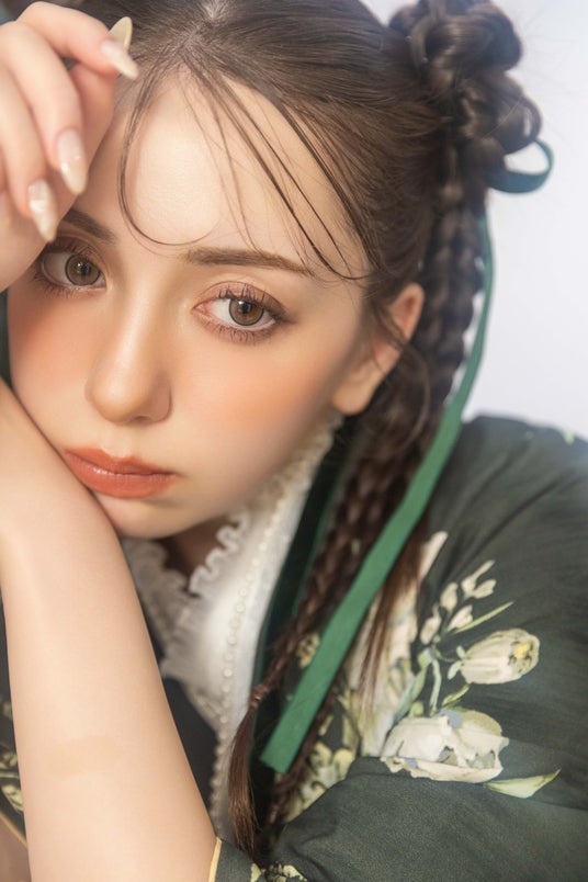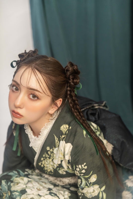 ヘアは、三つ編みとお団子にポイントで緑のリボンをつけて可愛らしさをプラス。