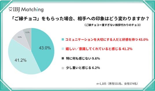 国内最多*¹の成婚数を誇る株式会社IBJ(代表取締役社長:石坂 茂、本社:東京都新宿区、東証プライム:6071、以下「IBJ」)が運営する婚活パーティーサービス「IBJ Matching」は、婚活男女1,105人を対象に「バレンタインに関する意識調査」を実施。本調査では、交際前の相手に対し、気持ちを伝えすぎない“挨拶代わりのチョコ”を「ご縁チョコ」と定義。その受け止められ方や、バレンタインが出会いの進展に与える影響について調査しました。