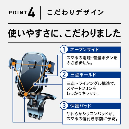 三点トライアングル構造で、スマートフォンをしっかりキャッチ。