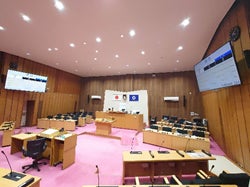 98インチのモニターが設置された議場