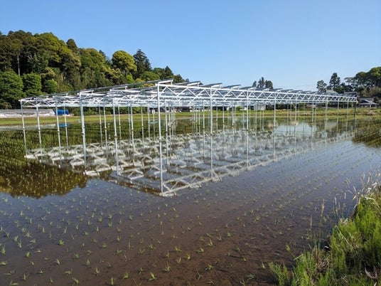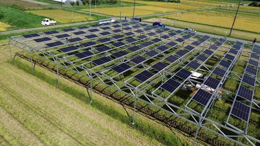 水稲経営と営農型太陽光発電事業を組み合わせた持続可能な農業経営モデル構築を目的として、営農型太陽光発電設備下に適した水稲の品種、栽培体系等の検討を行うとともに、市内水田地に適した営農型太陽光発電設備の設備設計、強度設計等を取りまとめ、発電した電気を地域で利用するモデルの検討を実施しています。