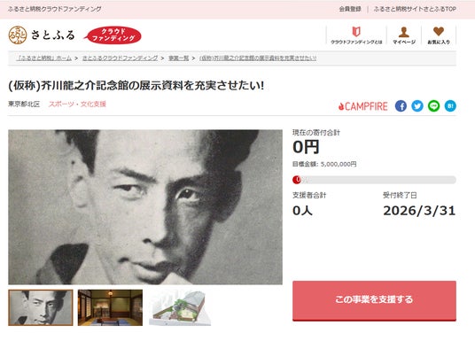 東京都北区とふるさと納税ポータルサイト「さとふる」を運営する株式会社さとふる(本社:東京都中央区、代表取締役社長 兼 CEO:藤井 宏明)は、「さとふるクラウドファンディング」にて、「(仮称)芥川龍之介記念館の展示資料を充実させたい!」の寄付受け付けを2025年4月1日より開始します。なお、本事業は2024年6月から継続して寄付募集をしており、今回で4回目となります。