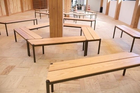 本校舎では、床材・壁材の一部、下足入れ、交流ホールベンチなどに地元・福島県産木材を約16m³使用しています。地域材の活用は、林業振興や森林資源の循環利用といった地域経済への寄与に加え、児童・生徒が地域の資源に触れながら学べる教育環境の形成にもつながります。この県産材の利活用は、森林環境の保全、および森林を全ての県民で守り育てるという「福島県森林環境税」の目的に沿った取り組みとなっており、これを財源とした福島市森林環境交付金事業補助金(※7)の交付を受けております。地産地消による木材活用を通じて、地域に根ざした学びの場づくりを支援しています。