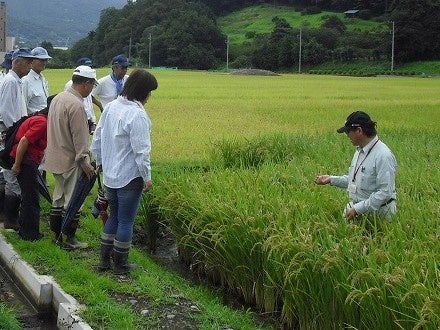 ほ場整備後の稲の生育状況を地元農家と調査