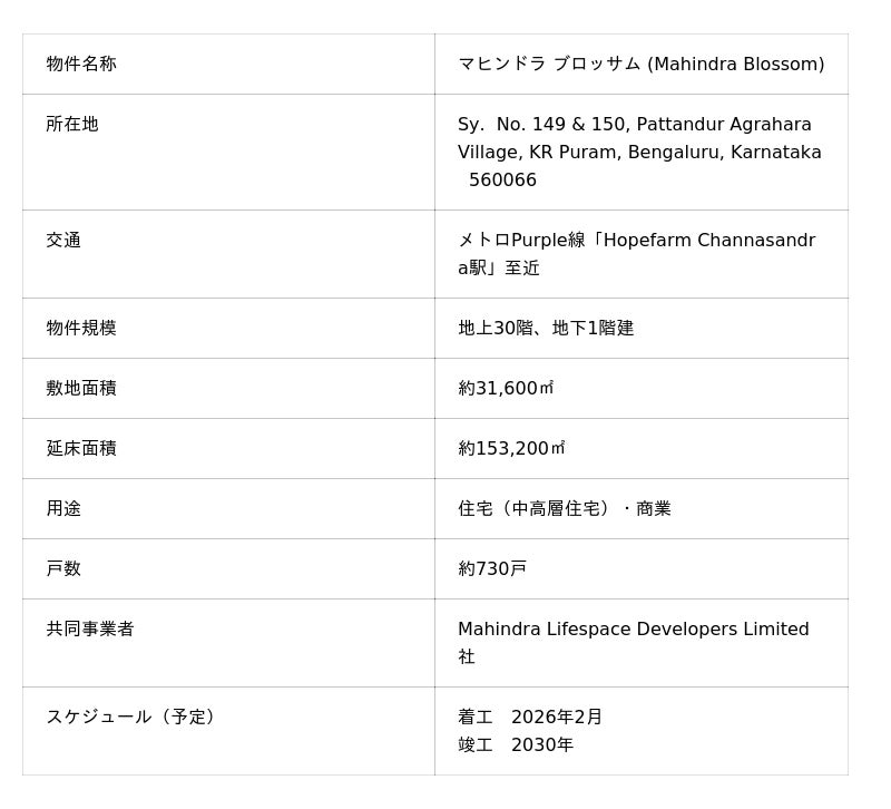 ・共同事業者はインドを代表するコングロマリットMahindra & Mahindraグループの不動産事業を担う中核企業Mahindra Lifespace Developers Limited社