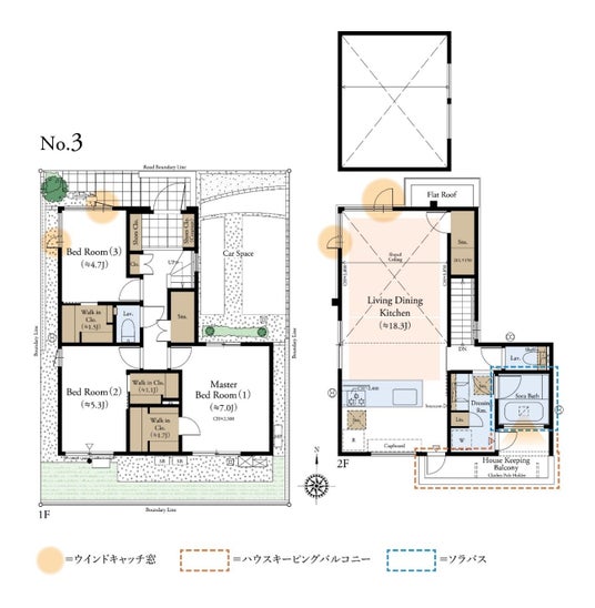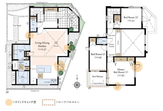 本物件では、YKK AP株式会社と協業検討し、自然エネルギーを最大限に活用しながら、機械に頼らず快適で省エネな住環境を実現する設計手法である“パッシブデザイン”の一環として「ウィンドキャッチ窓※1」を全棟LDK空間に実装いたします。 これは当該地域のアメダスデータによる風配図を元に、分譲地周辺の建物状況も考慮の上、夏・冬、日中・夜間の風向きに対して最適な窓配置と窓の開き方まで細密にシミュレーションし設計したものです。YKK AP株式会社と物件単位でここまで詳細の検証を行ったのは初の試みです。