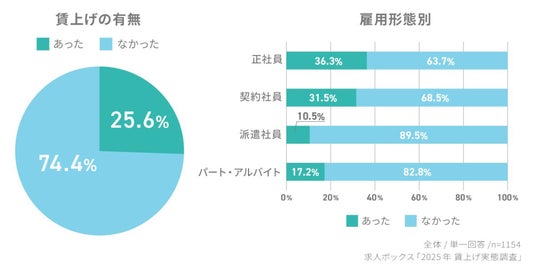 2025年の賃上げの有無について尋ねたところ、「なかった」と回答した人が74.4%と多数を占め、「あった」と回答した人は25.6%にとどまりました。
