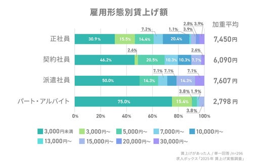 特にパート・アルバイトでは、75.0%が「3,000円未満」に集中しており、賃上げ額にも大きな差があることが明らかとなりました。