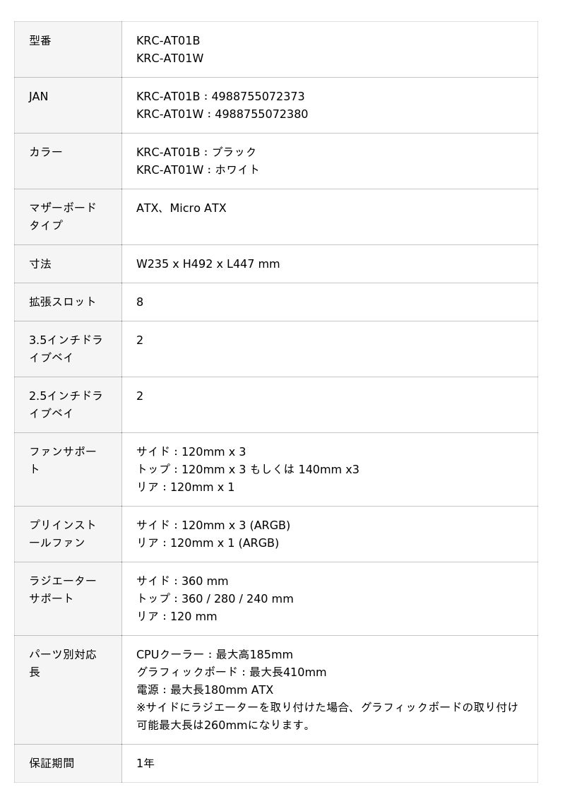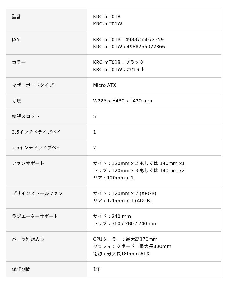 ATX対応の『KRC-AT01シリーズ』、Micro ATX対応の『KRC-mT01シリーズ』の2モデル展開で、各モデルともブラックとホワイトの2色のカラーバリエーションとなっています。