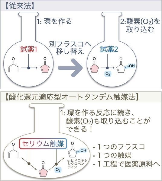 この技術を使うことで、医薬品合成に有用な「α-ヒドロキシシクロペンテノン」という物質を最大99%の収率で合成できます。このように、1つのセリウム触媒が外部からの操作無しにその役割を切り替え、2つの異なる反応のバトンを繋ぐ「酸化還元適応型オートタンデム触媒法(注3)」という新しいコンセプトを確立しました。なお、この触媒技術は発火性や爆発性のある危険な試薬を使わず汎用的な実験器具のみで実施できるため、特別な装置を必要としません。