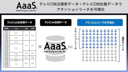 近年では、テレビ番組やテレビCMが放映されている時間帯に、生活者がどれだけ画面に注目しているかを表す「注視率」に対する関心が高まっています。注視率が高いテレビCMほど生活者のそのコンテンツに対する興味・関心度合いは深いと考えられ、より大きな広告効果が期待できます。本機能では、REVISIO株式会社(本社:東京都千代田区 代表取締役社長:郡谷 康士)の持つ注視率データと、AaaSに蓄積された出稿データを掛け合わせることで、テレビCMにおけるアテンションリーチを広告主ごとに可視化することができるようになります。これにより、キャンペーン中に出稿したCMが実際にどのくらいの人に注視されたのかを把握できます。