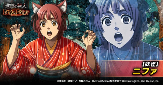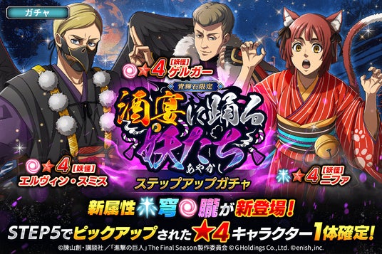 株式会社enish(本社:東京都港区、代表取締役社長:安徳 孝平、以下enish)は、アニメ『進撃の巨人』のスマートフォンゲーム最新作「進撃の巨人Brave Order」にて、2025年8月29日(金)より、新イベント「酒宴に踊る妖たち」を開催!また、本日より【妖怪】エルヴィン・スミス、【妖怪】ニファ、【妖怪】ゲルガーが新属性の朧&穹で登場する「酒宴に踊る妖たちガチャ」も開催!その他、最新情報はゲーム公式サイト・ゲーム公式X(旧Twitter)アカウントにて随時公開して行きますので、ぜひご覧ください。