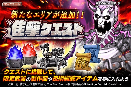 本日、2025年8月29日(金)より、進撃クエストに新たなエリアが追加!クエストに挑戦して限定武器の製作図や技術訓練アイテムを手に入れよう!