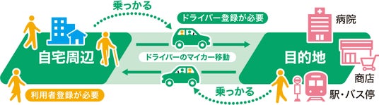 「ノッカルおの」は、各地区と中心街を行き来したい乗客が、住民が運転するマイカーに「乗っかる」仕組みで、助け合いによる完全予約型の乗合交通です。ドライバーは助け合いの精神のもと、地区内の利用者を車に乗せ、目的地まで送迎します。利用者は、ドライバーの予定を確認の上で事前予約し、ドライバーのマイカーで目的地まで移動します。