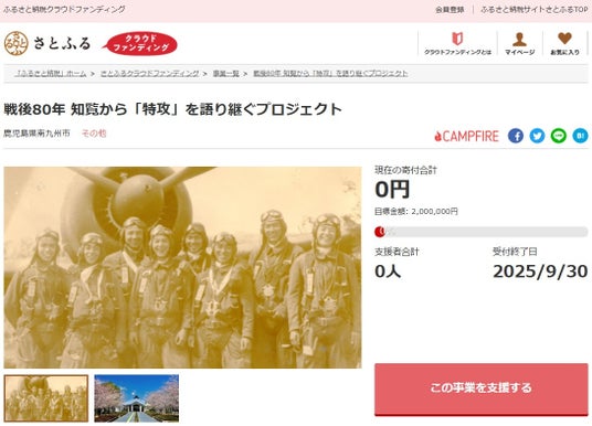 鹿児島県南九州市とふるさと納税ポータルサイト「さとふる」を運営する株式会社さとふる(本社:東京都中央区、代表取締役社長 兼 CEO:藤井 宏明)は、「さとふるクラウドファンディング」にて、「戦後80年 知覧から『特攻』を語り継ぐプロジェクト」の寄付受け付けを2025年7月3日より開始します。なお、本事業の寄付募集は2024年に続き2回目となります。