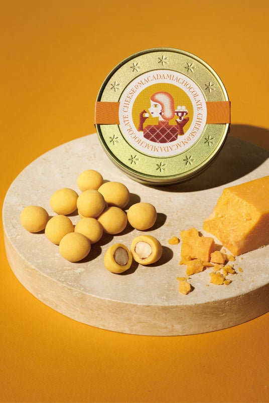 ホワイトチョコレートをベースに、塩味を効かせたチェダーチーズチョコレートを組み合わせ、コク深いチーズの風味を存分に引き出しています。さらに、香ばしくキャンディングしたマカダミアナッツを使用し、味わいと食感にアクセントをプラス。仕上げには、甘味と塩味のバランスを整えるメイプルシュガーを纏わせ、各素材の味わいをしっかりと引き出しつつ、それぞれの複雑な味わいが見事に調和する一粒に仕上げました。一粒の中に何層にも重なり合った、こだわりのあまじょっぱい味わいをお楽しみいただけます。