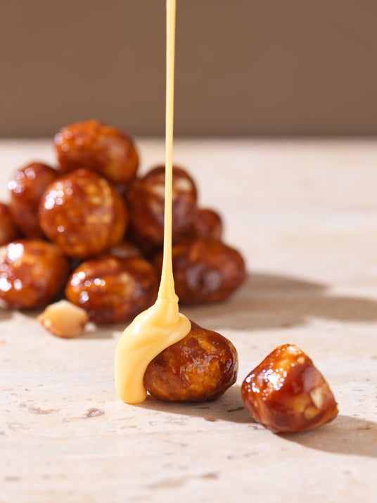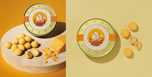 一粒でしっかりとしたチーズの味わいを感じていただける、“本格的なチーズスイーツとしての完成度”を目指し、素材選びにも徹底的にこだわりました。濃厚なチーズ感を存分に感じていただけるよう、要となるチーズには、クセが少なく、深いコクと芳醇な味わいを兼ね備えたチェダーチーズを選定。合わせるナッツは、ナッティーでクリーミーなコクと、深くリッチな味わいが特徴のマカダミアナッツを採用しました。さらに、キャンディングを施したことで、味わいや食感にアクセントを付け、マカダミアナッツ特有の柔らかな食感がチョコレートとの一体感をより感じさせる仕上がりになりました。そして、仕上げには、ナッツと相性の良いメイプルシュガーを選定。メイプル独特の香りやコクが味わいにさらなる深みを演出し、全体のバランスを整える重要な役割を担っています。