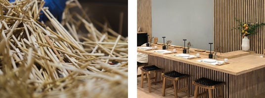写真:ChopValue Japan提供(左:使用済み割り箸を「ごみ」から「資源」へ、右:割り箸をリサイクルして作られた特製材を使用したカウンターテーブルと壁パネル)