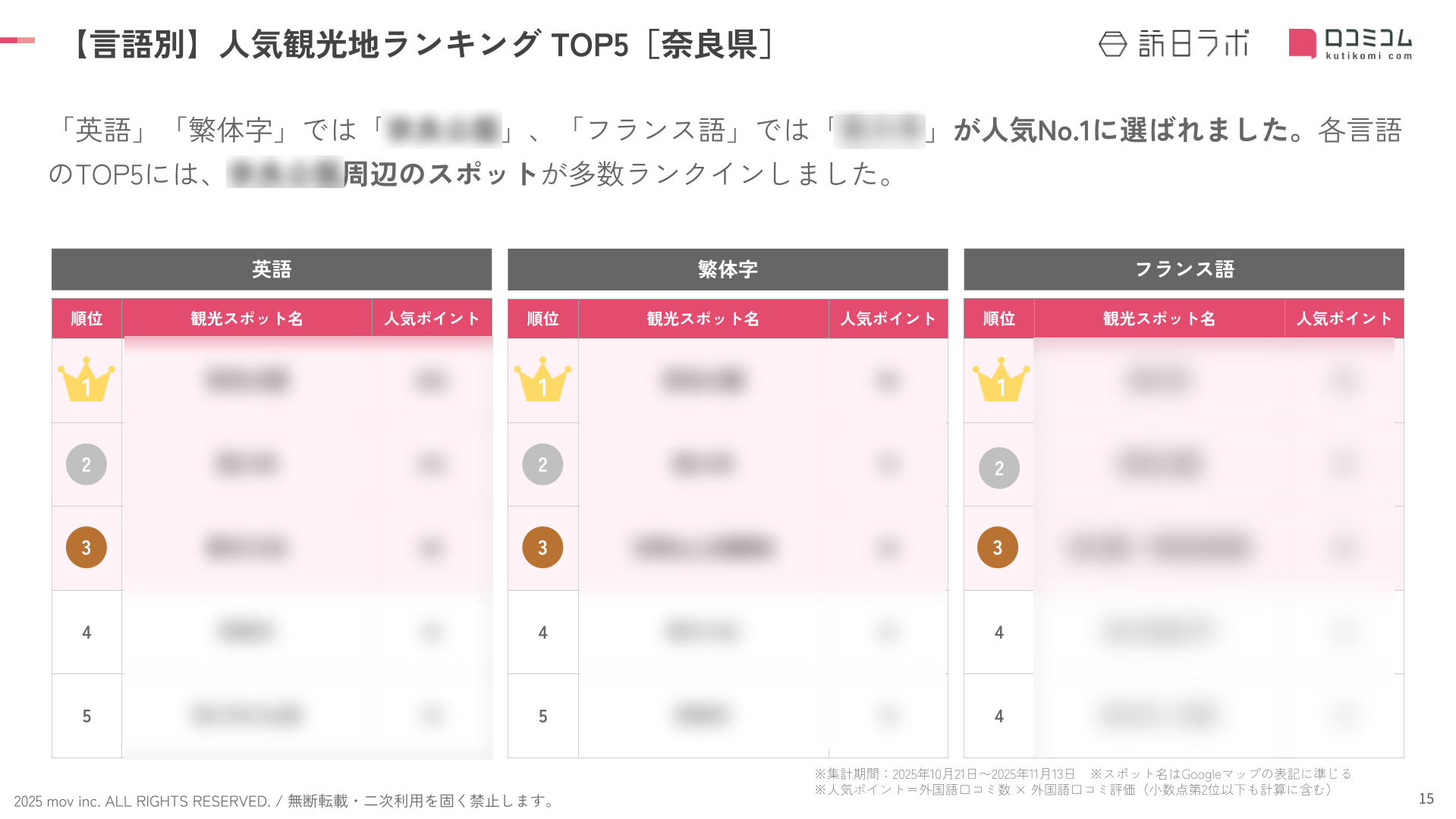 - 調査対象:訪日ラボが独自に選出した奈良県の観光スポット(計2,506 件)