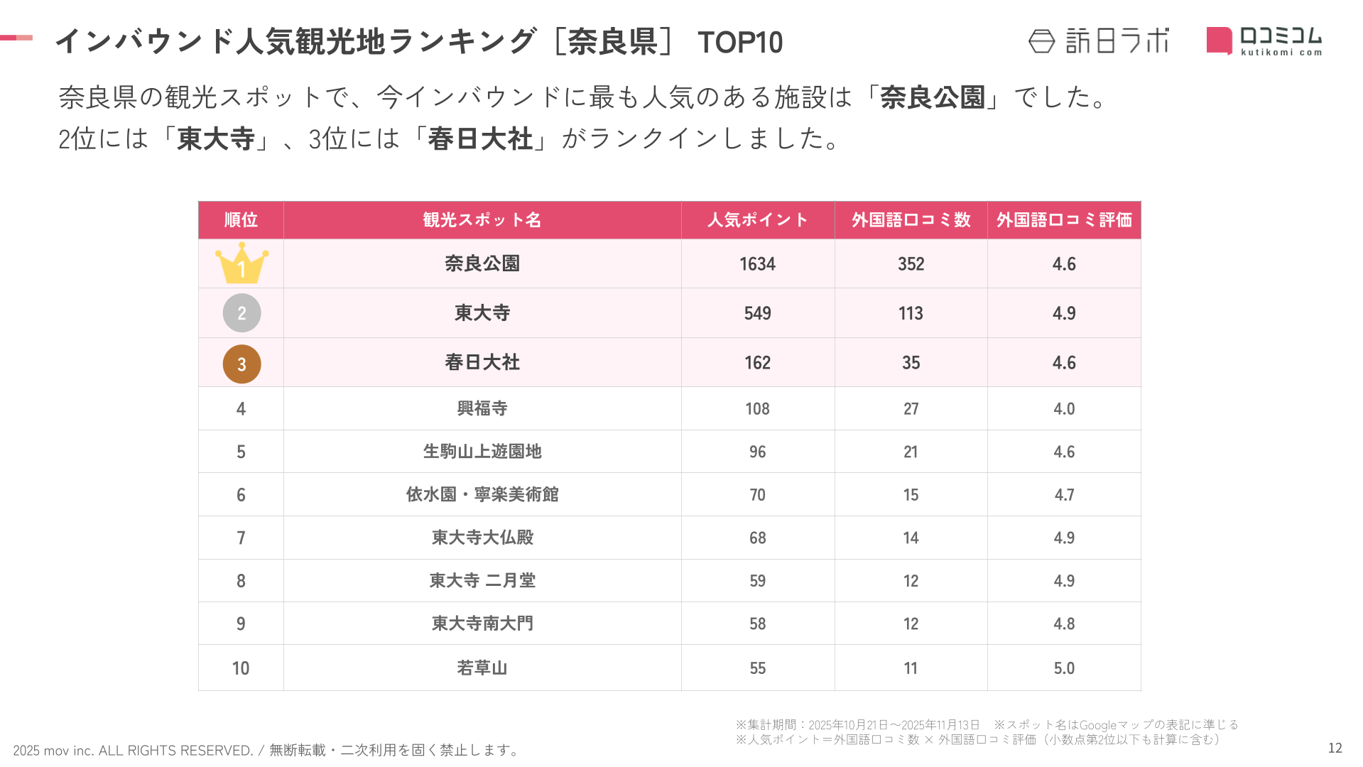 業界最大級のインバウンドビジネスメディア「訪日ラボ」及び 店舗向け集客一元化プラットフォーム「口コミコム」を運営する株式会社mov(代表取締役:渡邊 誠、本社:東京都渋谷区、以下mov)は、奈良県の観光地に寄せられた最新の口コミデータから、独自の『インバウンド人気観光地ランキング』を発表しました。