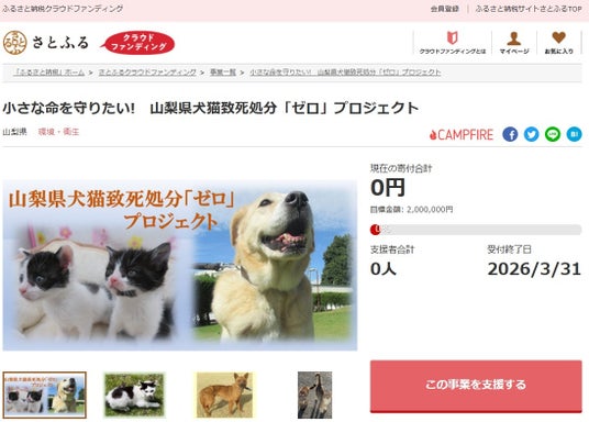 ふるさと納税ポータルサイト「さとふる」を運営する株式会社さとふる(本社:東京都中央区、代表取締役社長 兼 CEO:藤井 宏明)は、「さとふるクラウドファンディング」にて、山梨県「小さな命を守りたい! 山梨県犬猫致死処分『ゼロ』プロジェクト」の寄付受け付けを2025年8月4日より開始します。なお、本プロジェクトは今回で7回目の寄付募集となります。