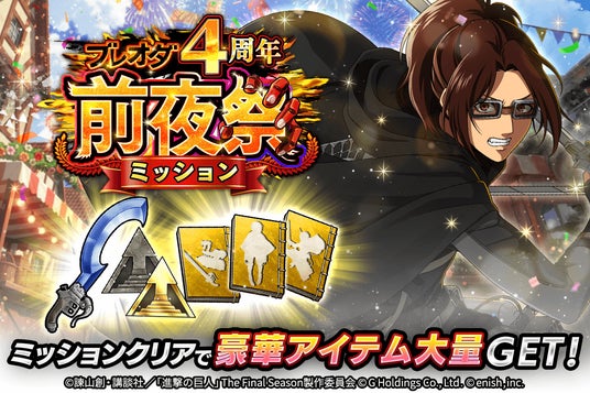 株式会社enish(本社:東京都港区、代表取締役社長:安徳 孝平、以下enish)は、アニメ『進撃の巨人』のスマートフォンゲーム最新作「進撃の巨人Brave Order」にて、2026年2月3日(火)より、ブレオダ4周年前夜祭を開催!本キャンペーンではログインで特別なガチャが無料で最大200連可能なキャンペーン等、お得なキャンペーンを多数開催!その他、最新情報はゲーム公式サイト・ゲーム公式X(旧Twitter)アカウントにて随時公開して行きますので、ぜひご覧ください。