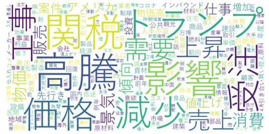 企業からのコメント、「高騰」、「価格」、「関税」、「トランプ」などのワードが頻出