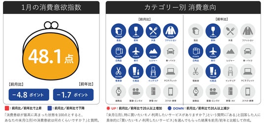 1月の消費意欲指数は、年末の行事やセールの前倒しなどの影響で前月比大幅減。食・衣を中心に多くのカテゴリーで消費意向低下