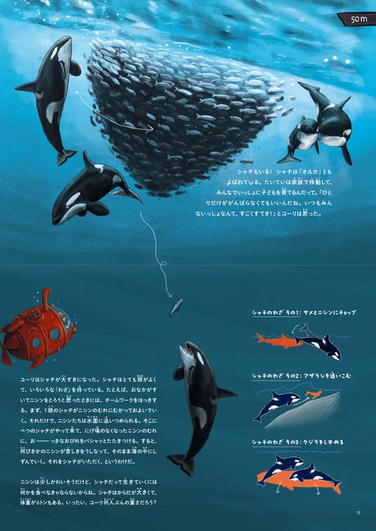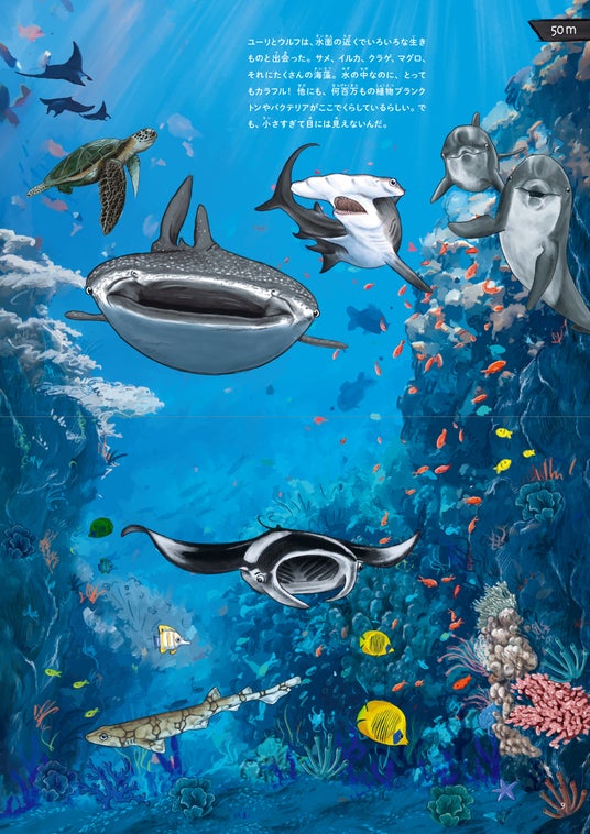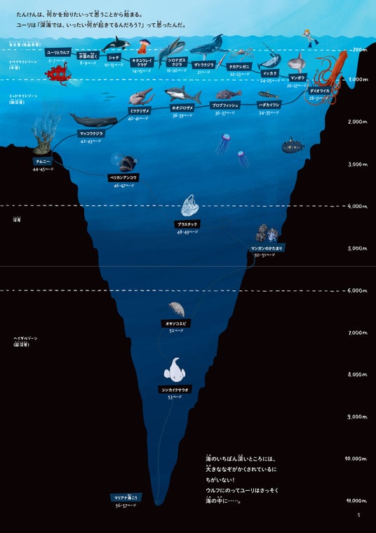 私たちが住んでいる地球の約7割は海ですが、海の中はほとんどのことが謎に包まれています。本書では、海の表面から一番深いといわれているマリアナ海溝まで、もぐりながら海の生き物やそのふしぎな生態を紹介します。シャチやシロナガスクジラのちょっと変わった餌の取り方や、深海の魚が光っている理由など、ナビゲーターの女の子がユーモアを交えながら案内します。一緒に海をもぐるように、海のふしぎが楽しく学べる絵本です。