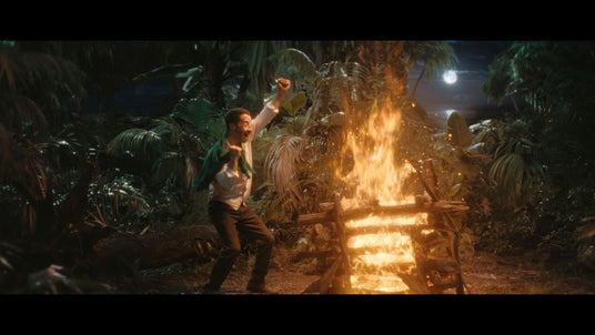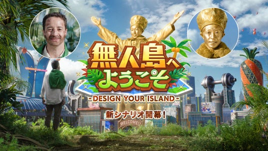 今回のCMでは、新育成シナリオ「無人島へようこそ -DESIGN YOUR ISLAND-」の舞台となっている無人島にちなんで、ルメールさんが無人島に漂着するシーンから展開されます。まるで映画のワンシーンのような緊張感漂うルメールさんの無人島生活シーンから一変…! 森の茂みを抜けた先でルメールさんが目にしたのは開拓された街と…巨大な金の武豊像!?