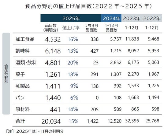 2025年通年の値上げは、11月までの公表分で累計2万34品目となった。前年の実績(1万2520品目)を60.0%上回り、2023年(3万2396品目)以来、2年ぶりに2万品目を超えた。1回当たり値上げ率平均は15%と、前年(17%)をやや下回る水準が続いた。食品分野別では「調味料」(6148品目)が最も多く、前年(1715品目)から+4433品目・+258.5%と大幅に増加したほか、年間では2022年以降で2番目に多い水準となった。「酒類・飲料」(4801品目)は、清涼飲料水のほか、ビール、清酒、焼酎、ワインといった洋酒など広範囲で値上げとなり、前年比で8割を超える大幅増となった。「加工食品」(4532品目)は、冷凍食品やパックごはん、海苔などの値上げが目立った。2025年における飲食料品値上げの勢いは前年に比べて強い状態が続いている。