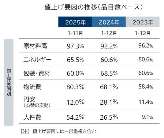 2025年の飲食料品値上げは、原材料高に加えて物流費や賃上げによる労務費など、粘着性が高く、国内の経済情勢に起因した圧力が強まっている。国際的な小麦・食用油や原油価格の急騰、急激な円安による輸入物価の上昇など、一過性とみられた外的要因による物価高が主だった2023年~2024年前半の値上げラッシュから、持続的で内的要因によるインフレ傾向に変化した。そのため、継続的な価格引き上げが不可欠となっていることも、比較的低位に抑制された前年から値上げ品目数が大幅に増加する要因となっている。