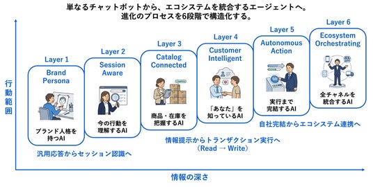 このモデルを起点に、企業が「今どのレイヤーにいるか」「次にどこを目指すか」を明確にした上で、目標レイヤーへの到達に向けた構築・運用を段階的に支援します。ブランドの人格設計(Layer 1)から始め、在庫・顧客データとの連携(Layer 3~4)、購買の自律実行(Layer 5)、全チャネル統合(Layer 6)へと、企業の状況に応じたペースで進化させていきます。