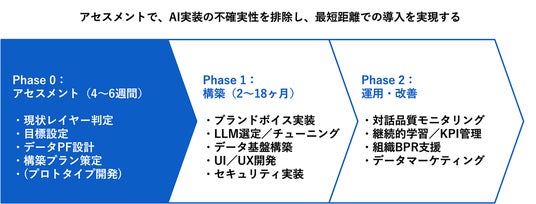 本サービスは、まず4~6週間のアセスメントフェーズ(Phase 0)でブランドCX起点でのAIエージェントの目標像を定義し、実現に向けた段階的な構築プランと費用対効果を策定します。その後、同プランに基づき、AIエージェントの設計・開発から、品質モニタリング・継続学習・KPI管理・対話データを活用した顧客インサイトの発掘まで、プロジェクト全体を一貫して伴走します。
